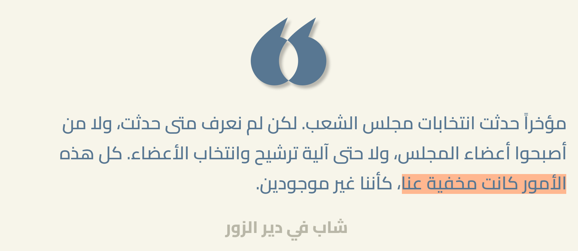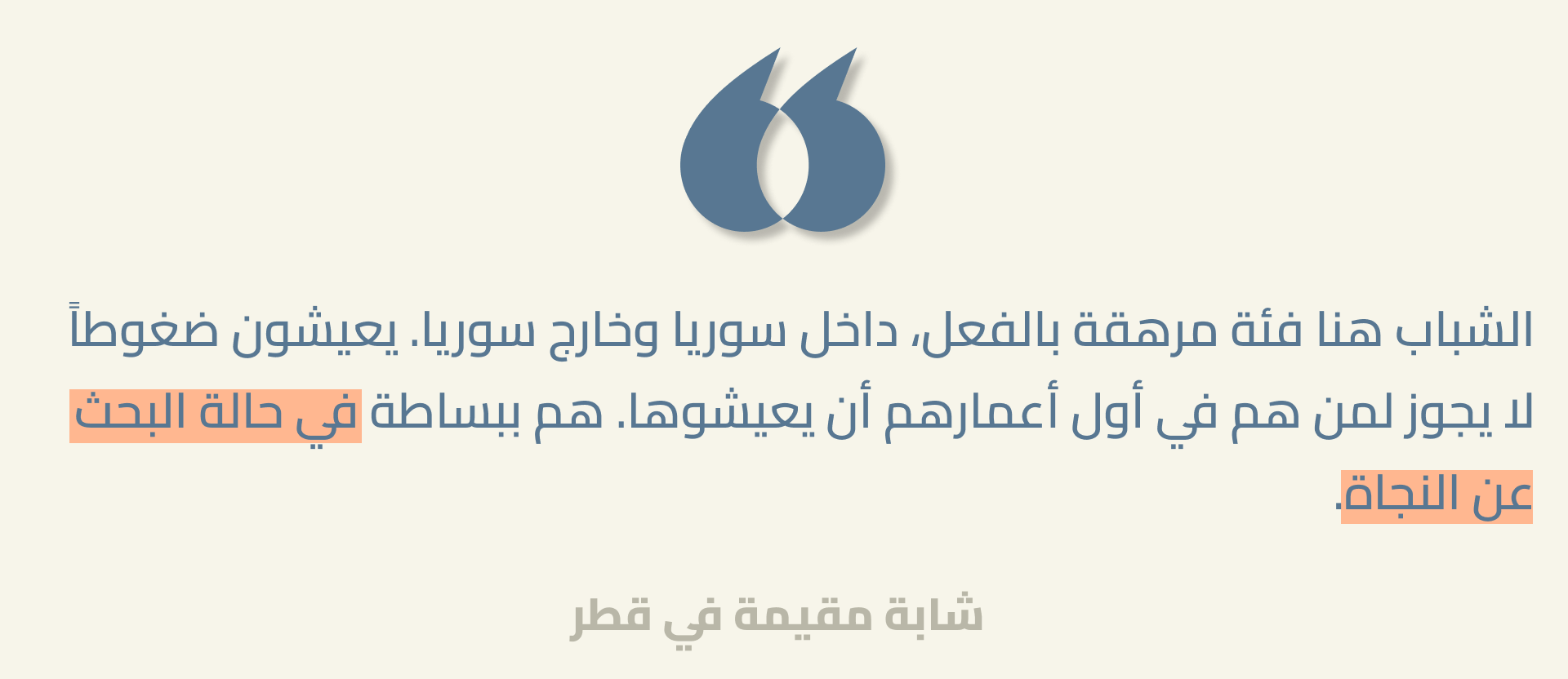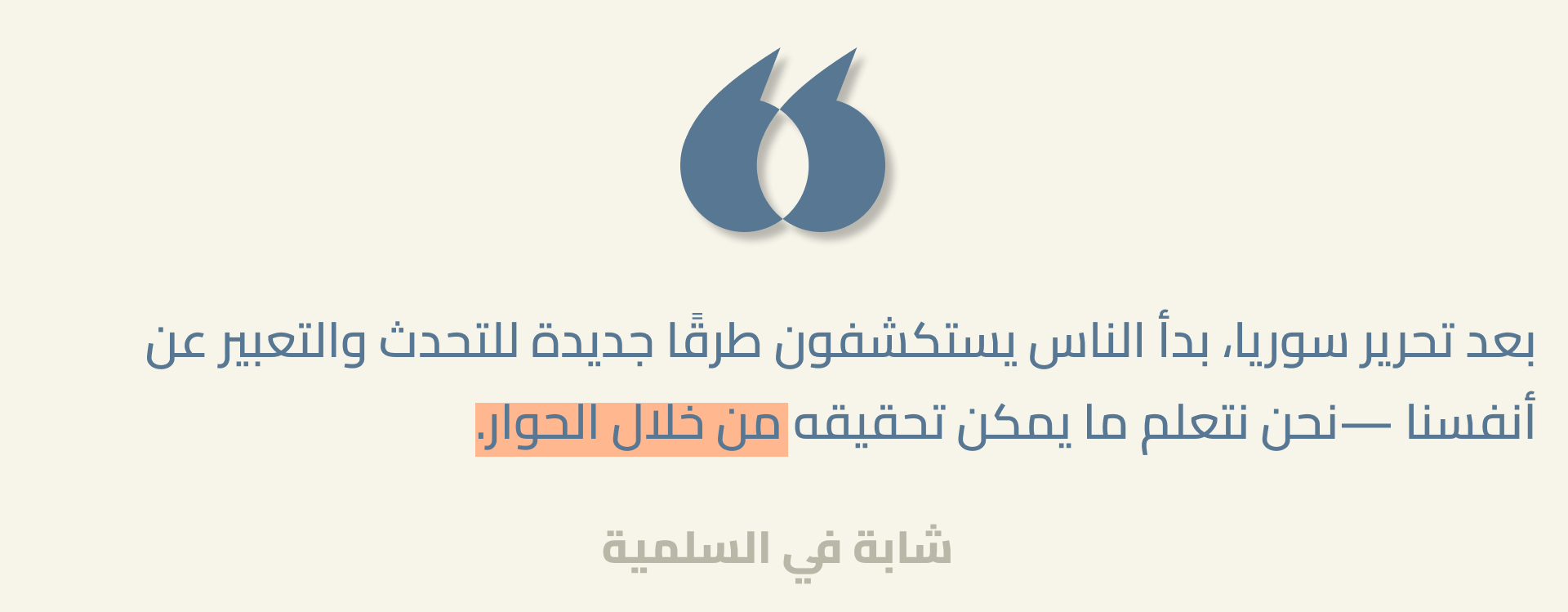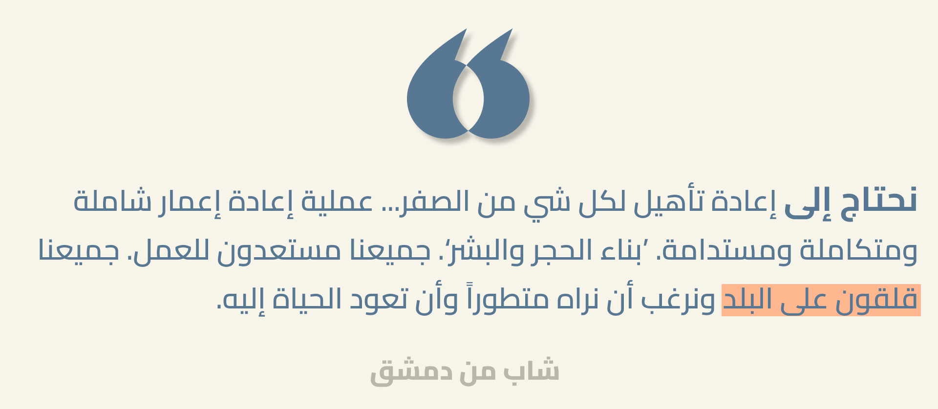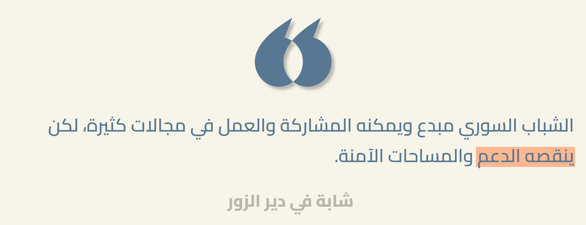 الأصوات الموثّقة هنا تمثّل مساهمة ضرورية في مسار انتقال سوريا نحو مستقبل ديمقراطي عادل. يبلغ متوسّط عمر السوريين والسوريات 23 عاماً، وأكثر من 42% منهم دون سن الخامسة والعشرين. بالنسبة لبلد يسعى لإعادة إعمار ما خلّفته الحرب، هذه الشريحة العمرية فرصة هائلة. يمثل الشباب، بطاقتهم وأفكارهم وتفاؤلهم الذي يعكسه هذا البحث، رصيداً ثميناً للغاية. لكن الشباب بحاجة إلى فرص حقيقية في التعليم، والتدريب المهني، والعمل، والمشاركة السياسية الهادفة والحقيقية. أما في حال تهميشهم الاقتصادي وإقصائهم السياسي، وفي حال فشل رؤيتهم الساعية إلى مجتمع قائم على الحقوق، أو تبدّد اللحظة الحالية الحاسمة في موضوعي العدالة والمساءلة، فإن الخطر أن يصبحوا جيلاً ضائعاً تفقد بعدهم سوريا نافذة فرص قد لا تتكرر.