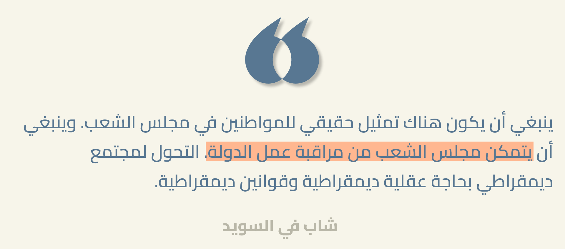 - ترسيخ الحقوق والحريات. يجب أن يكون ضمان الحقوق والحريات في صلب العقد الاجتماعي الجديد الجاري تشكيله بين الدولة والمواطنين. ينبغي تمكين المواطنين والمواطنات من التنظيم والتعبير دون خوف من القمع أوالانتقام، كما يجب ضمان حقوق النساء على قدم المساواة مع الرجال، ولا بد من الاستثمار في مكافحة التضليل الإعلامي الافتراضي