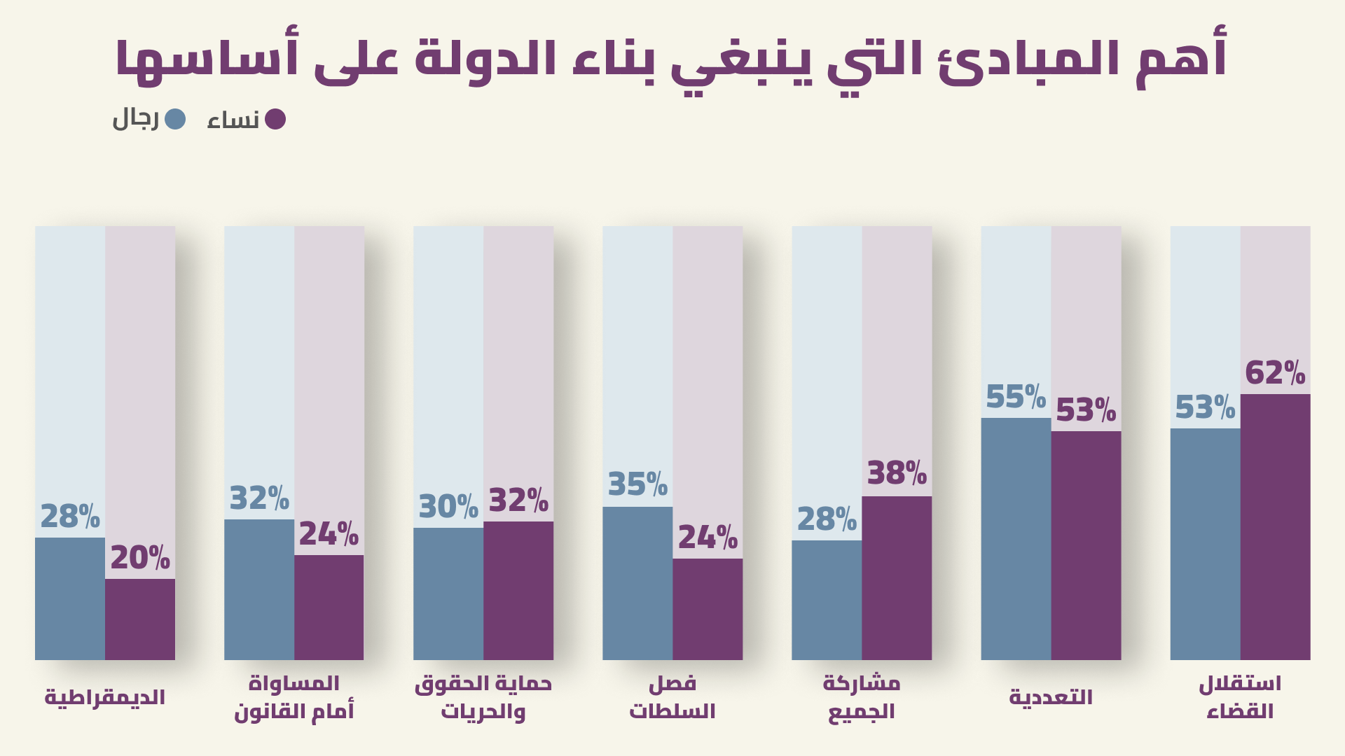 يعتقد 58% أن الحقوق والحريات هي المبدأ الأهم الذي ينبغي أن يقوم عليه الحكم السوري المستقبلي، فيما اختار 57% مبدأ الديمقراطية، و55% مبدأ المساواة أمام القانون.