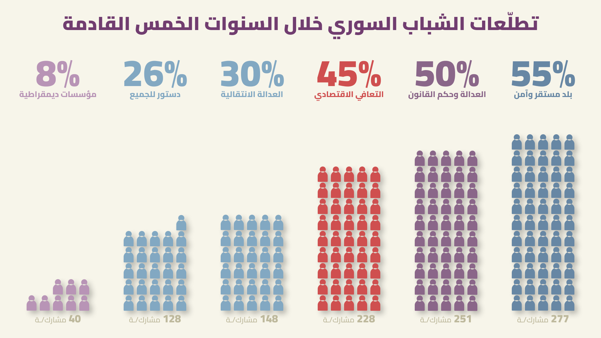 اختار 50% من المشاركين والمشاركات في الاستبيان «العدالة وسيادة القانون»، فيما نوّه 30% بأهمية «تطبيق العدالة الانتقالية» بوصفها أملهم الأساسي للسنوات الخمس القادمة.