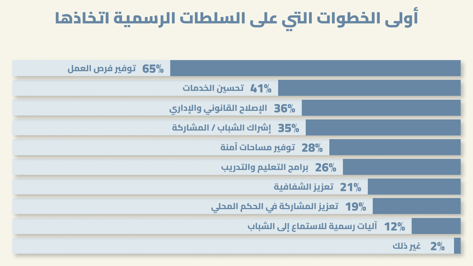 يرى 64% أن الأولوية القصوى للحكومة الانتقالية يجب أن تكون خلق وظائف وفرص عمل.