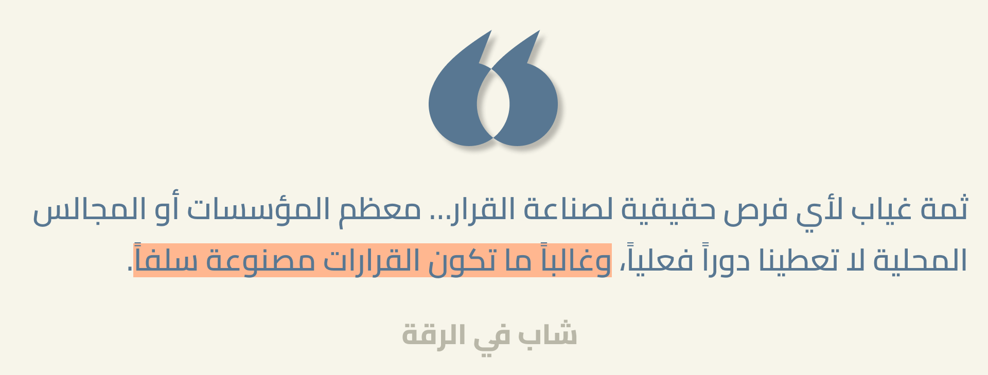 وفيما يتعلق بالمبادئ التي يودّ الشباب السوري أن يرى بلاده مبنية عليها، يبدو أن سعة المشاركة مبدأ أساسي. لكن يبدو أنه، في الوقت الحالي، حتى الشباب ذوو المهارات العالية والاندفاع الكبير يجدون صعوبة في الوصول إلى مساحات اتخاذ القرار الرسمية.