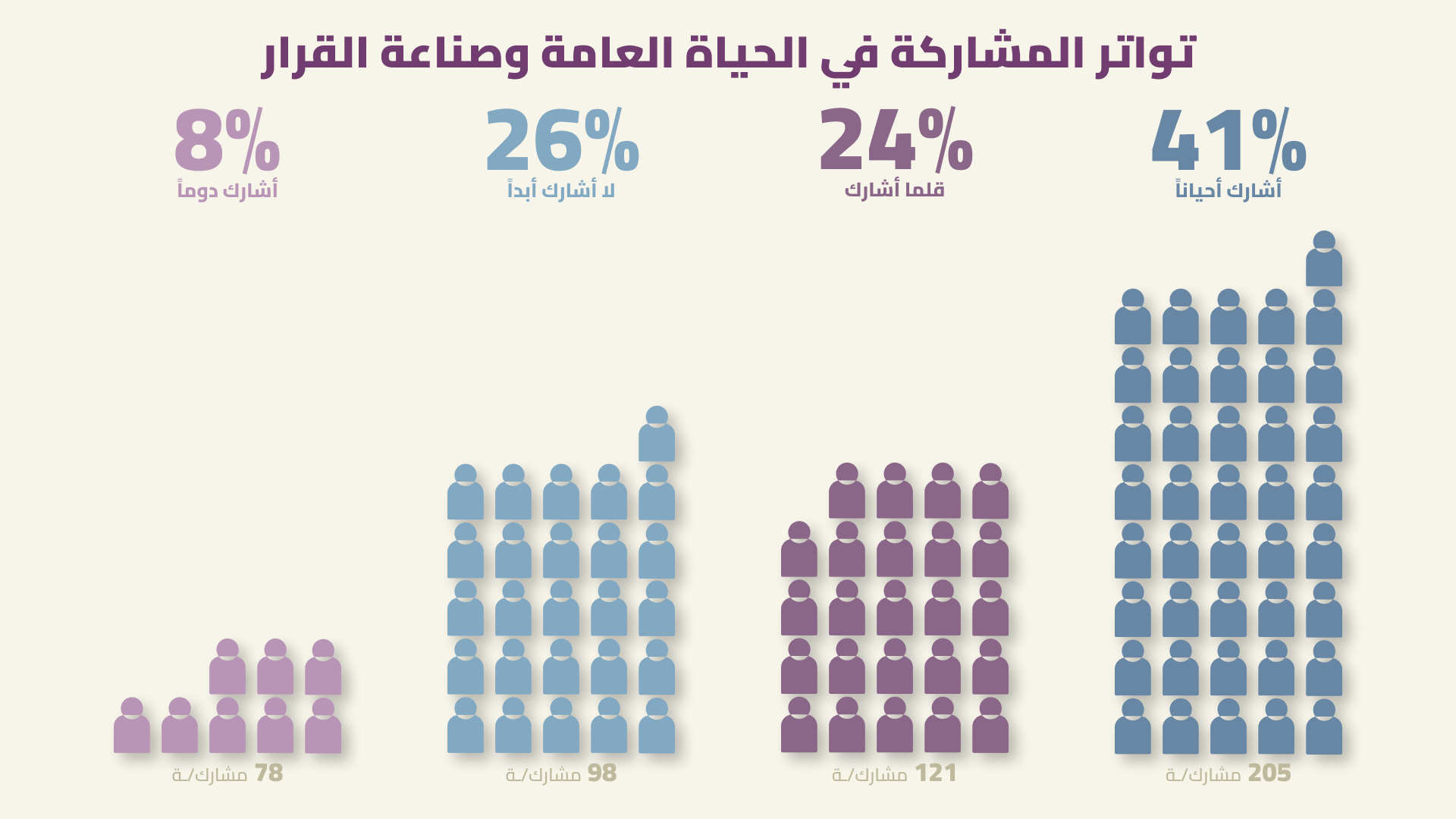 ثمة فرق بين المشاركة واتخاذ القرار. رصدنا شعوراً واسعاً بالإحباط لدى الشبان والشابات لأنهم «يشاركون من دون أن يقرروا». فعلى الرغم من انخراطهم العالي في العمل المجتمعي والتنظيم المدني، فقط 16% منهم قالوا إنهم يشاركون بالفعل في صنع القرارات المتعلقة بالحياة العامة، فيما أفاد 51% بغياب أي اشتباك أو صلة تربطهم بالسلطات الرسمية، واعتبر 32% أن المشاركة «عديمة الجدوى».