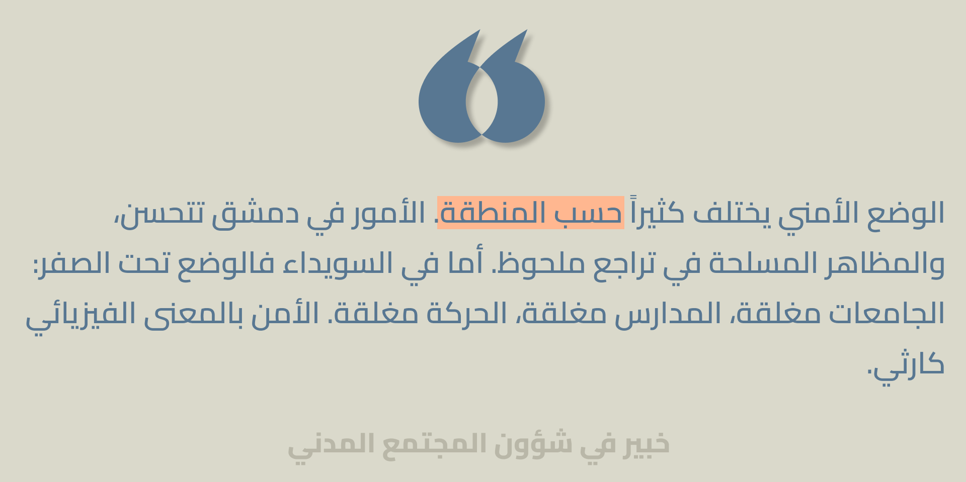 - ضمان السلامة والأمن بإنصاف في جميع أنحاء سوريا. يجب اتخاذ إجراءات فورية لتحسين الوضع الأمني في السويداء وحمص والمناطق الساحلية والشمال الشرقي، مع ضمان الحماية غير التمييزية للجميع والمحاسبة على جميع انتهاكات حقوق الإنسان