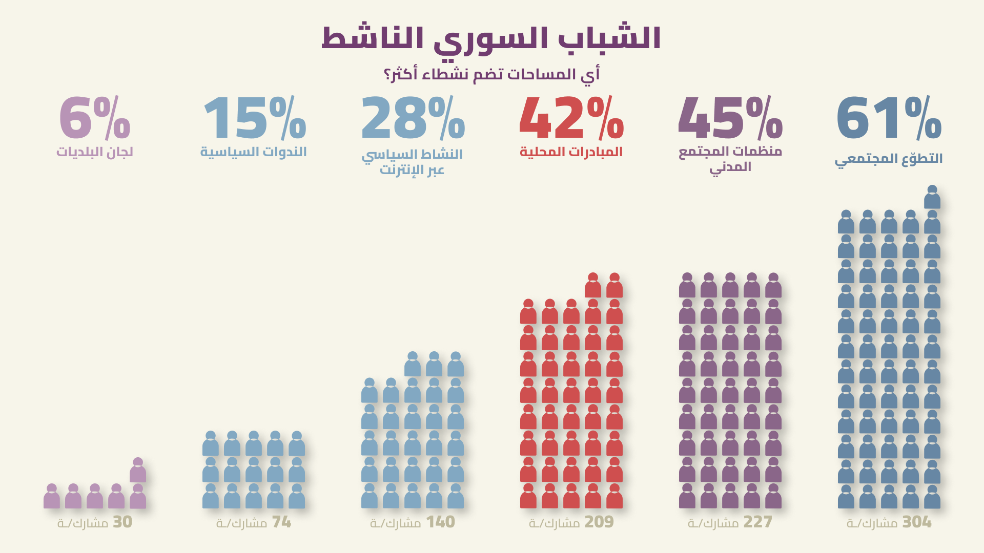 في ضوء العنف الفعلي - أو الخوف من العنف - الذي يعاني منه الشباب، إلى جانب الأوضاع الاقتصادية القاسية، يبدو لافتاً أن 61% من شباب سوريا منخرطون في أعمال تطوعية، وأن 45% نشطون مع منظمات المجتمع المدني، فيما يشارك 28% في النشاط السياسي عبر الإنترنت. هذا يعني أن طاقتهم ورغبتهم في المساهمة الإيجابية وخلق أثر ملموس في بلادهم، رغم كل الصعوبات، عنصر بالغ الحيوية لمستقبل سوريا.