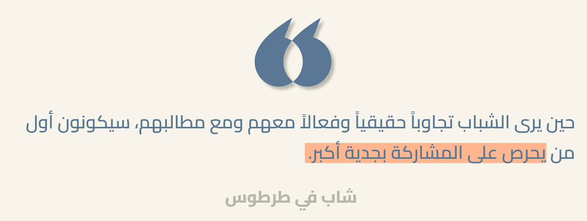 هذا الجيل قضى أكثر طفولته في الحرب، ومن المدهش أن نراه محافظاً على تجذّره في حياة مجتمعه، متعلّقاً بشدّة بمستقبل وطنه، ومطالباً بمساحة للتجريب والتنظيم والمشاركة فيه. ثمة آفاق جديدة بالكامل ترستم في هذه اللحظة الحاسمة للغاية - والهشة للغاية أيضاً - من تاريخ البلاد. ولذلك على مختلف الجهات، في الداخل والخارج، الإصغاء إلى مطالب هؤلاء الشباب والصبايا، ووضعها نُصب أعينهم أثناء مباشرة أعمالهم أو اتخاذ قراراتهم. إنها مرحلة نادرة تشهد تحوّلاً سياسياً واجتماعياً خاصاً، ومن الضروري أن يحضر فيها الشباب شركاء فعليين في القرارات التي ستحدد مسار حياتهم، فهم عماد من أعمدة المستقبل السوري الموعود: الشفاء، والتجدّد، السلام، النموّ والاستقرار المبني على العدالة، الديمقراطية، الحقوق والحريات.